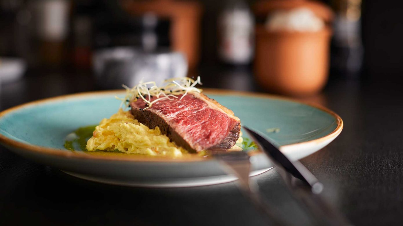 Das Pesto am Teller verstreichen, Apfel-Rettich-Salat darauf platzieren und zum Schluss ein Stückchen vom Beiried darauf geben.