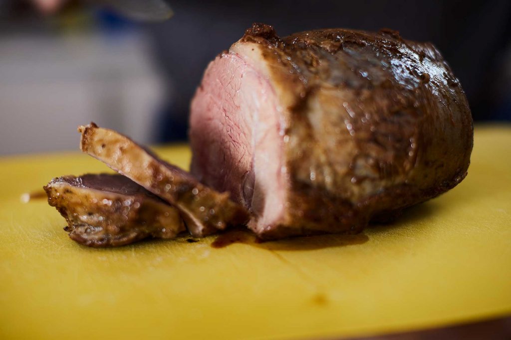 - Schmalz in einem großen Bräter erhitzen, das Fleisch von allen Seiten scharf anbraten. Dann das Fleisch herausnehmen und rasten lassen. Backrohr auf 100°C vorheizen.
