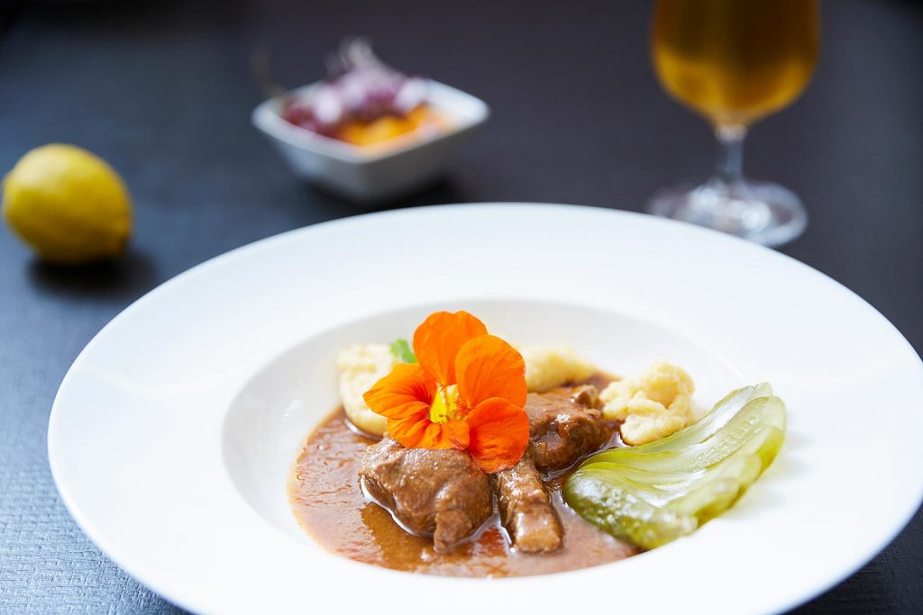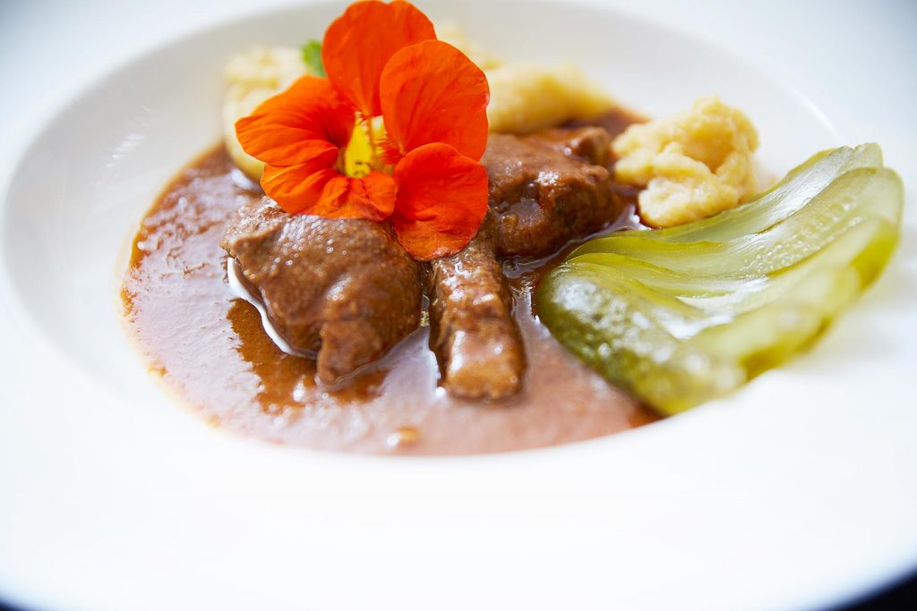 Mühlviertler Hopfengulasch mit Fächergurke und Kürbis-Nocken
