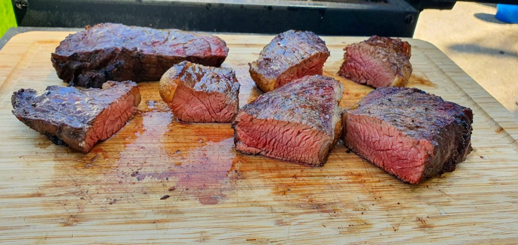 • Nach weiteren 15 bis 20 Minuten (insgesamt also ca. 50 Minuten) sollte man das Fleischthermometer zu Hilfe nehmen, um die gewünschte Kerntemperatur zu kontrollieren. Wer es gerne „Englisch“ mag, sollte 56-58°C erreichen. Garstufe „Medium“ ist bei ca. 62°C erreicht. Recht viel höher sollte die Kerntemperatur nicht mehr steigen, weil das Fleisch ansonsten trocken wird.